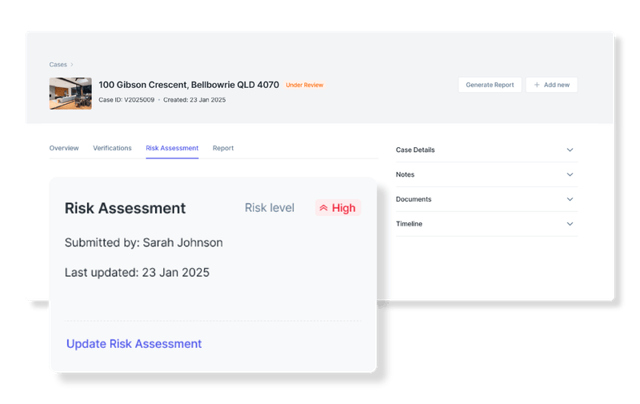 Each case has its own dedicated details page, which captures outcomes, status, verifications, risk assessment, documents, notes, reports and a detailed timeline of activity for audit purposes.