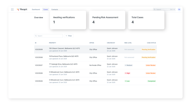 At a high level, compliance officers have the Reapit Verify Cases page, where they can easily track verifications, risk assessments and statuses across one or multiple offices, depending on your setup.