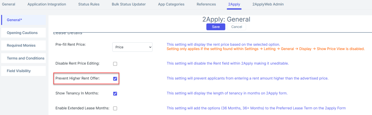 If you wish to make any changes, the setting can be found by navigating to Settings > Applications > 2Apply > General. In the Lease Details section, tick Prevent Higher Rent Offers checkbox. This setting will prevent applicants from entering a rent amount higher than the advertised price.